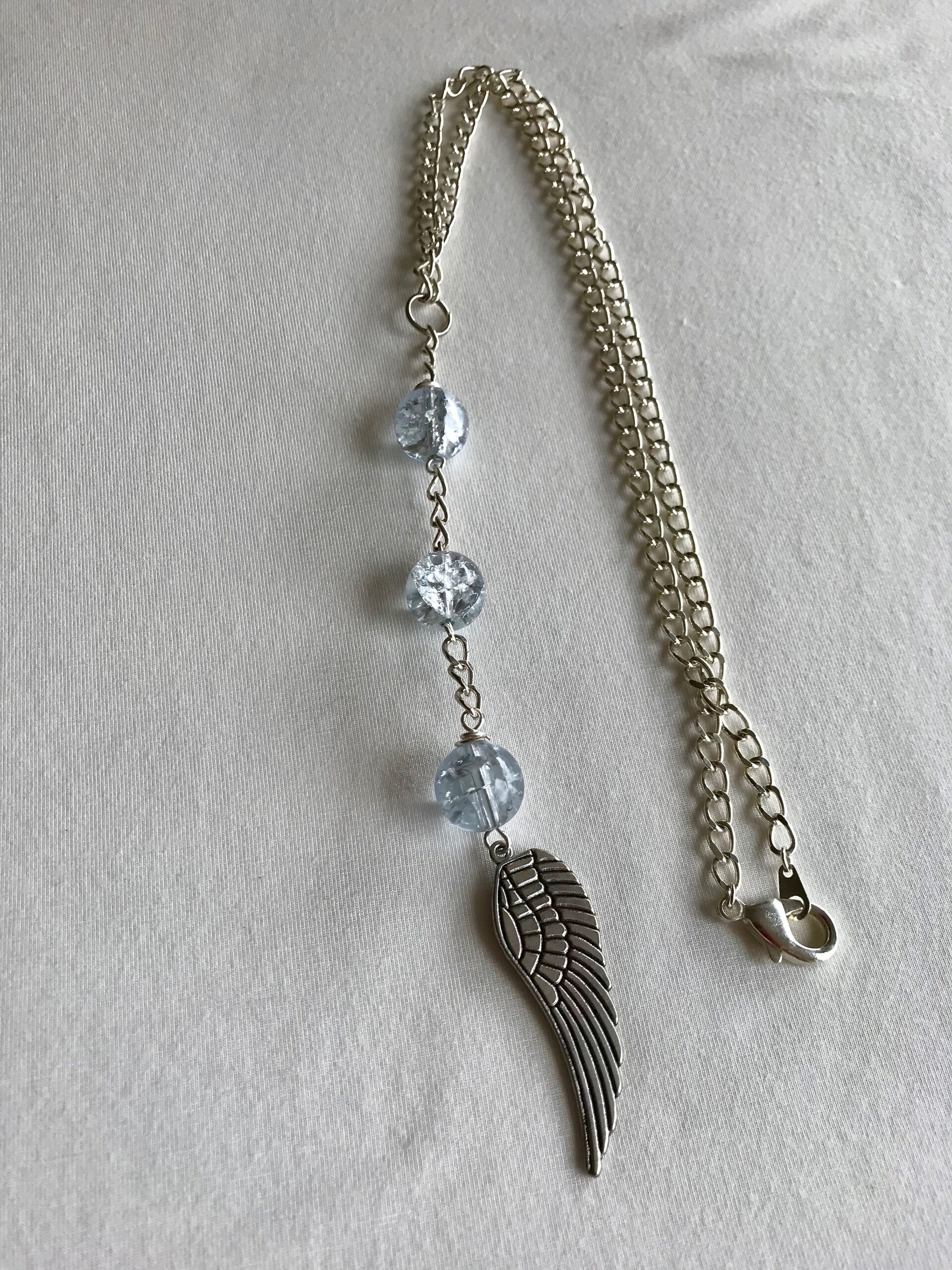This Necklace is 54cms in length around the neck approx. (The Crackle Glass & Heaven Wing are 15cms long.) Necklace Weighs 30 grams