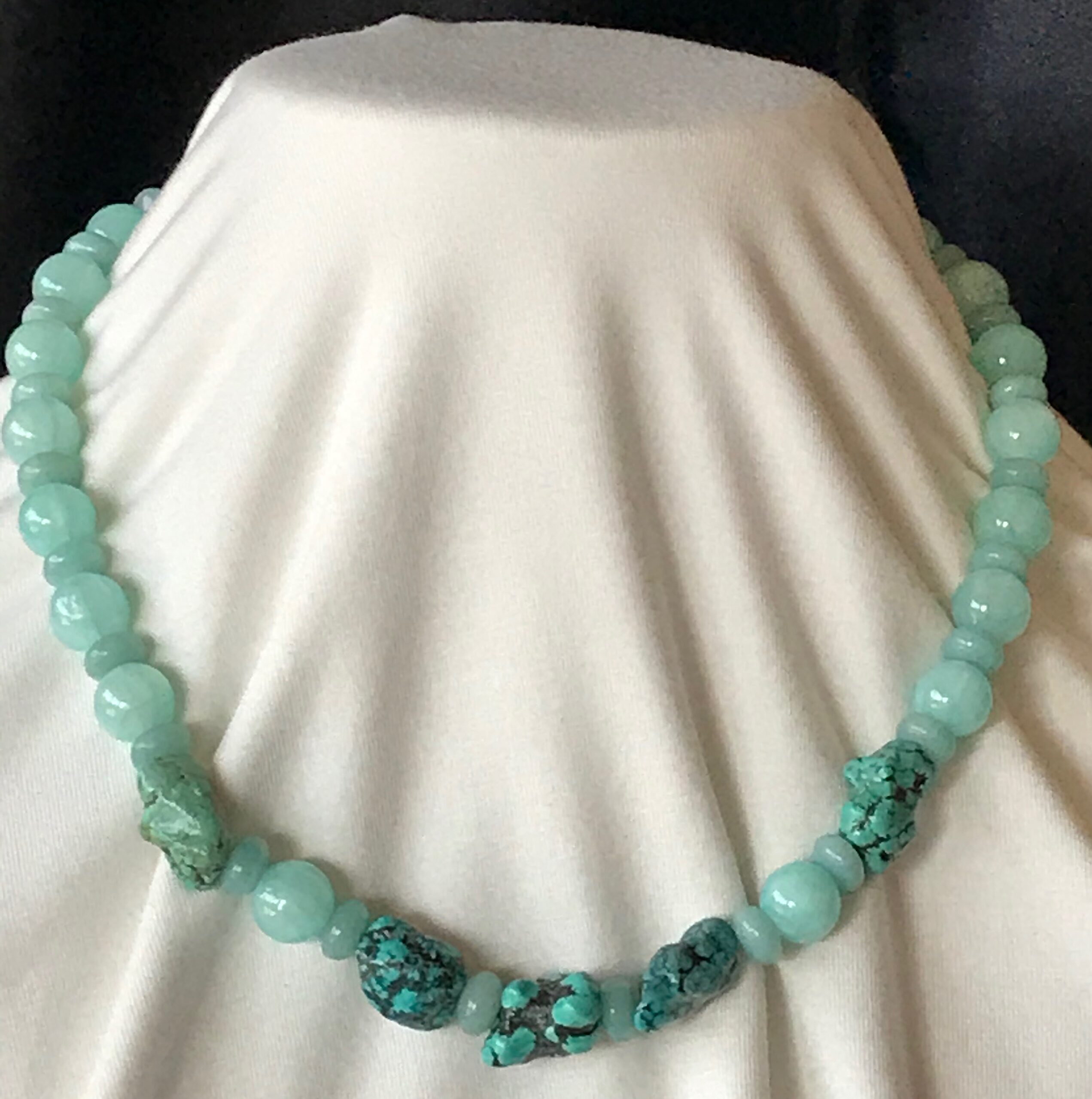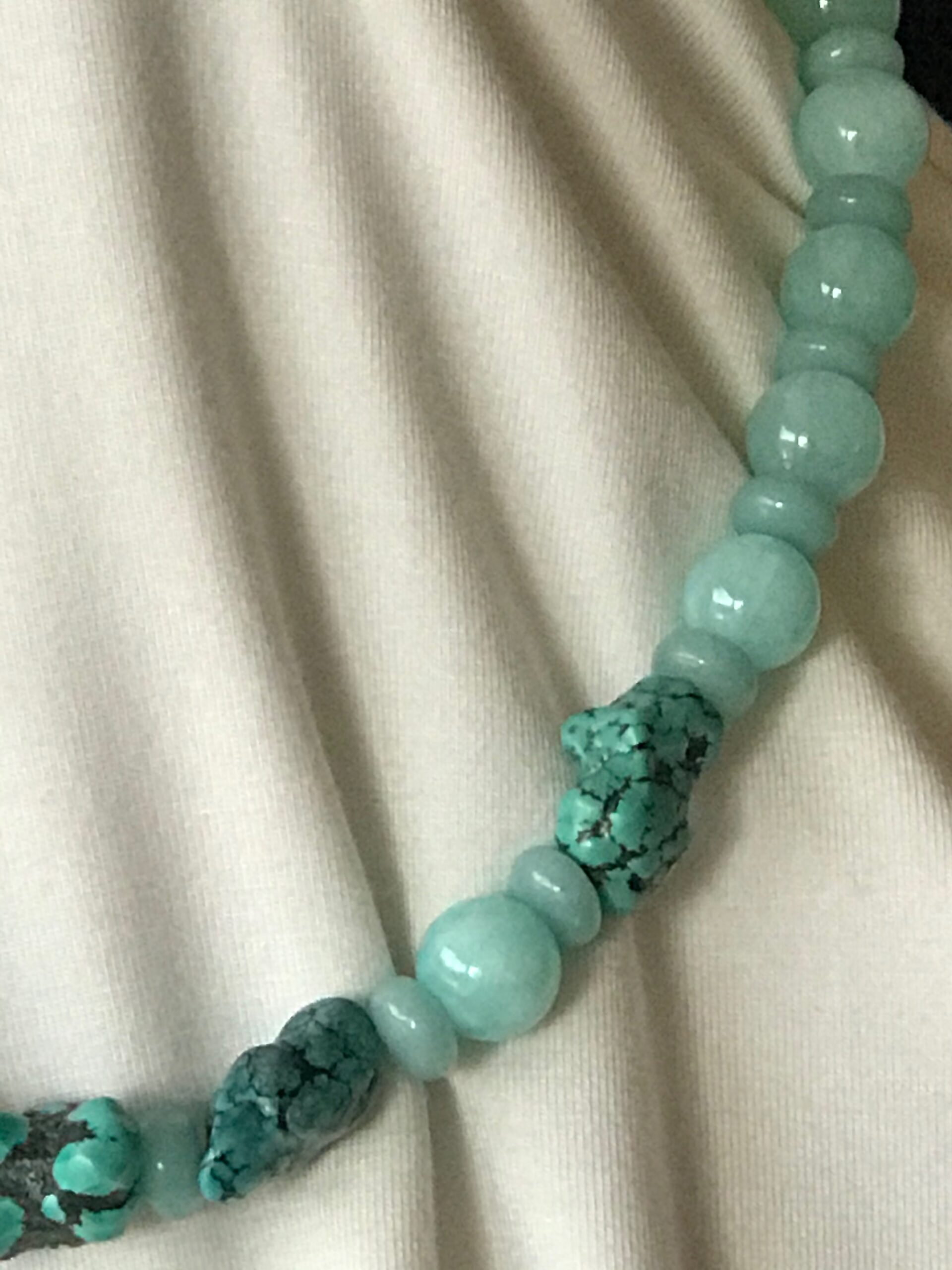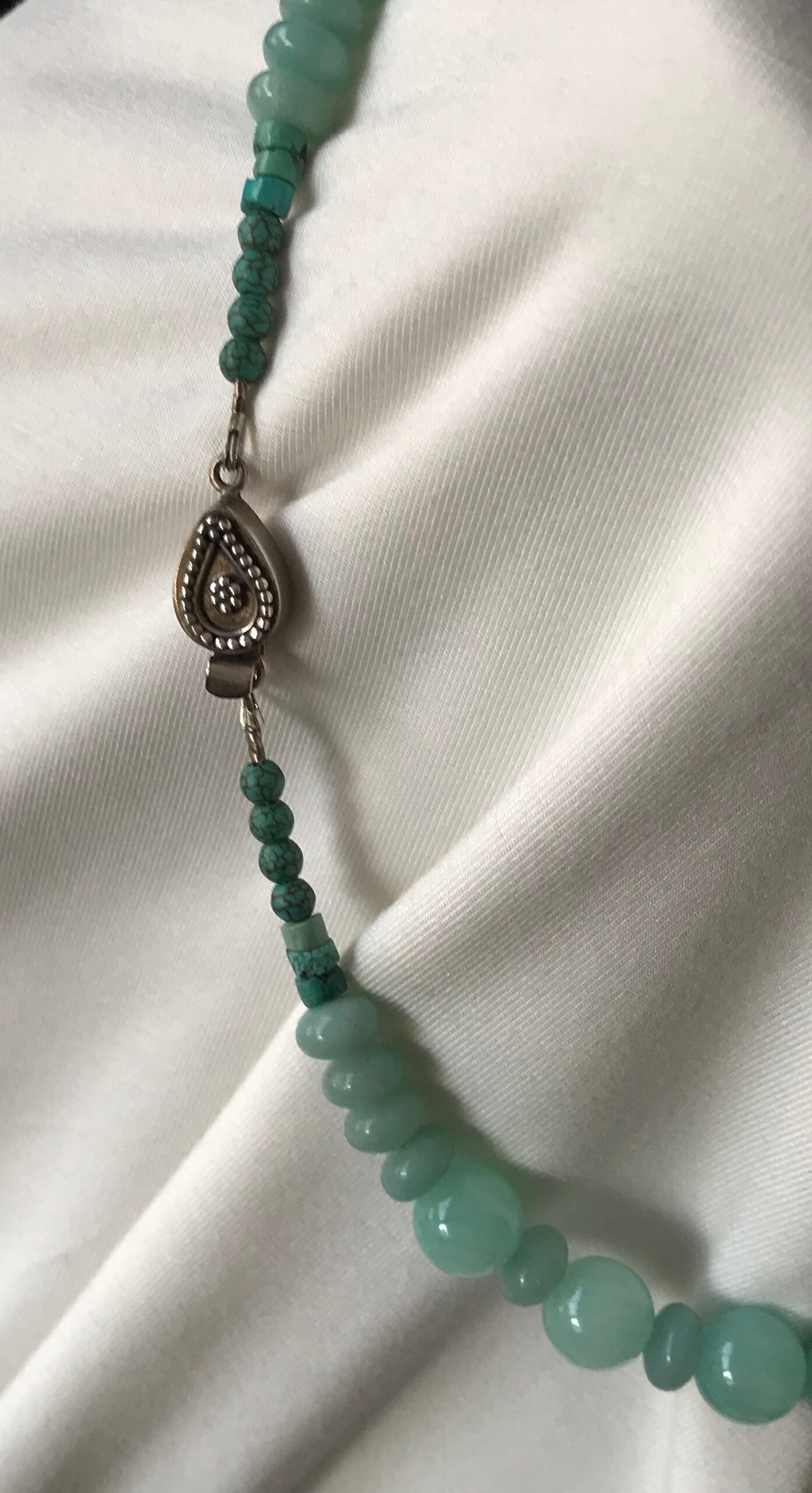 Composition: Sterling Silver press Clasp. Necklace finished off wih smaller flat Burmese Jade and turquoise small rounds