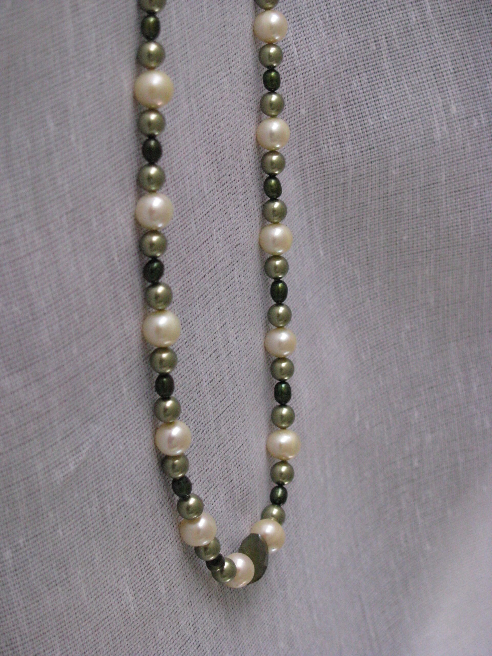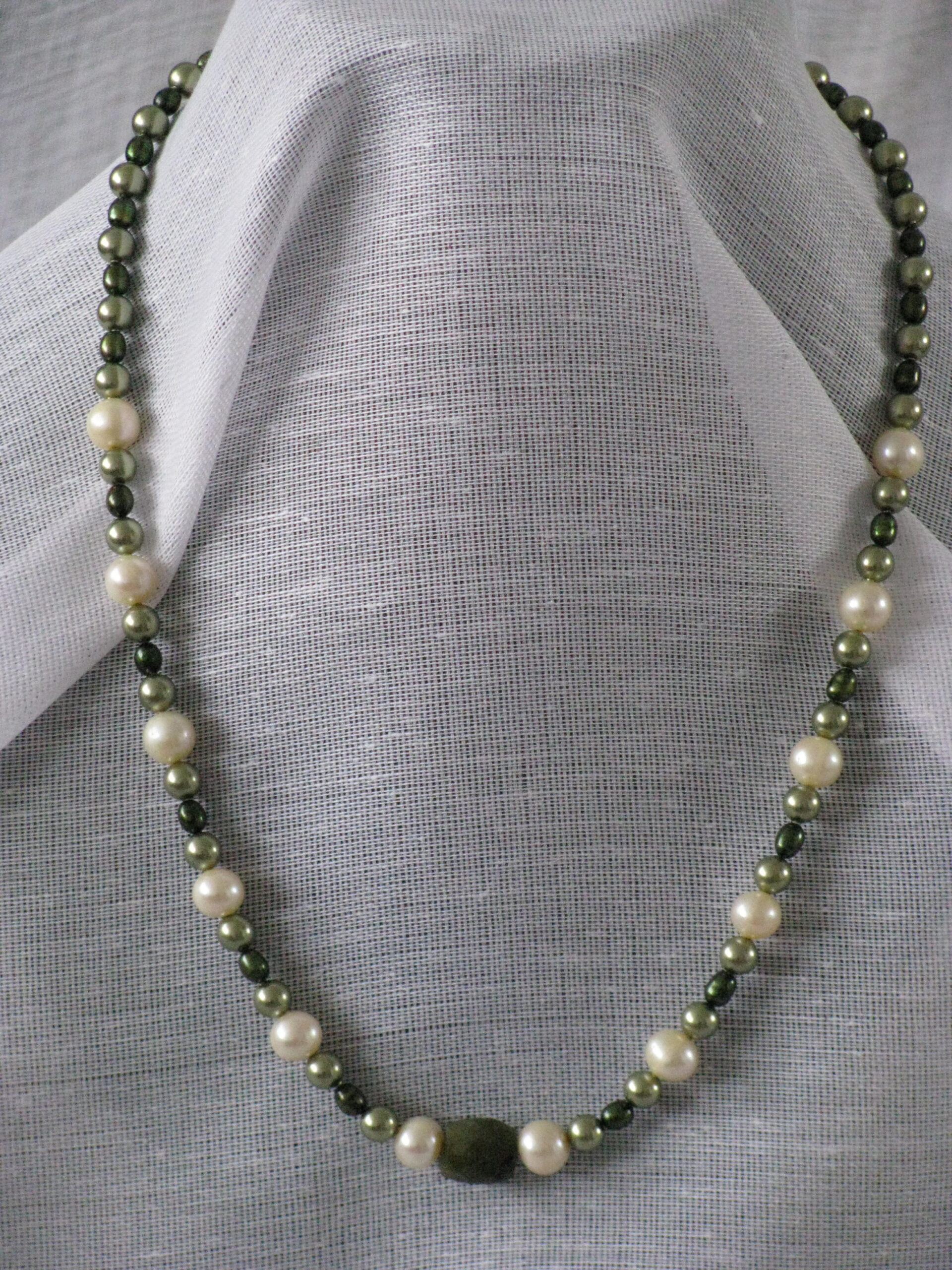Delicate necklace predominantly made with Freshwater olive and cream Swarovtski round pearls. With a Diopside Semi-Precious Stone.