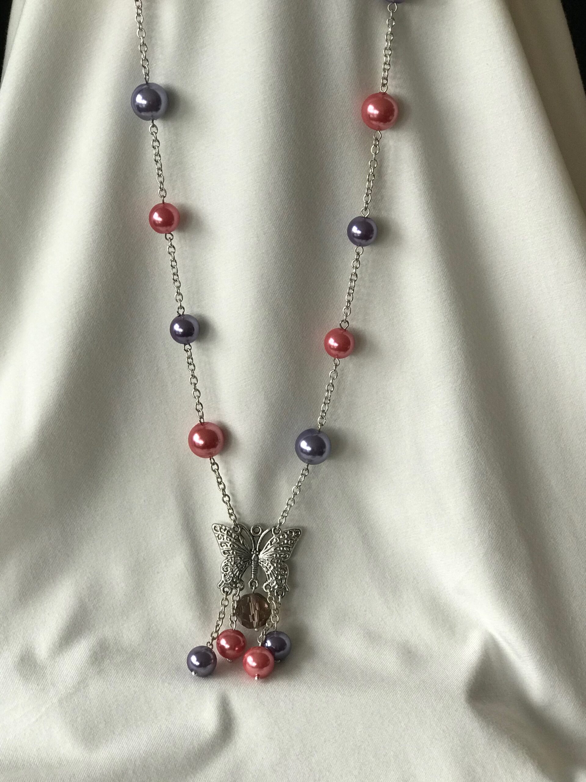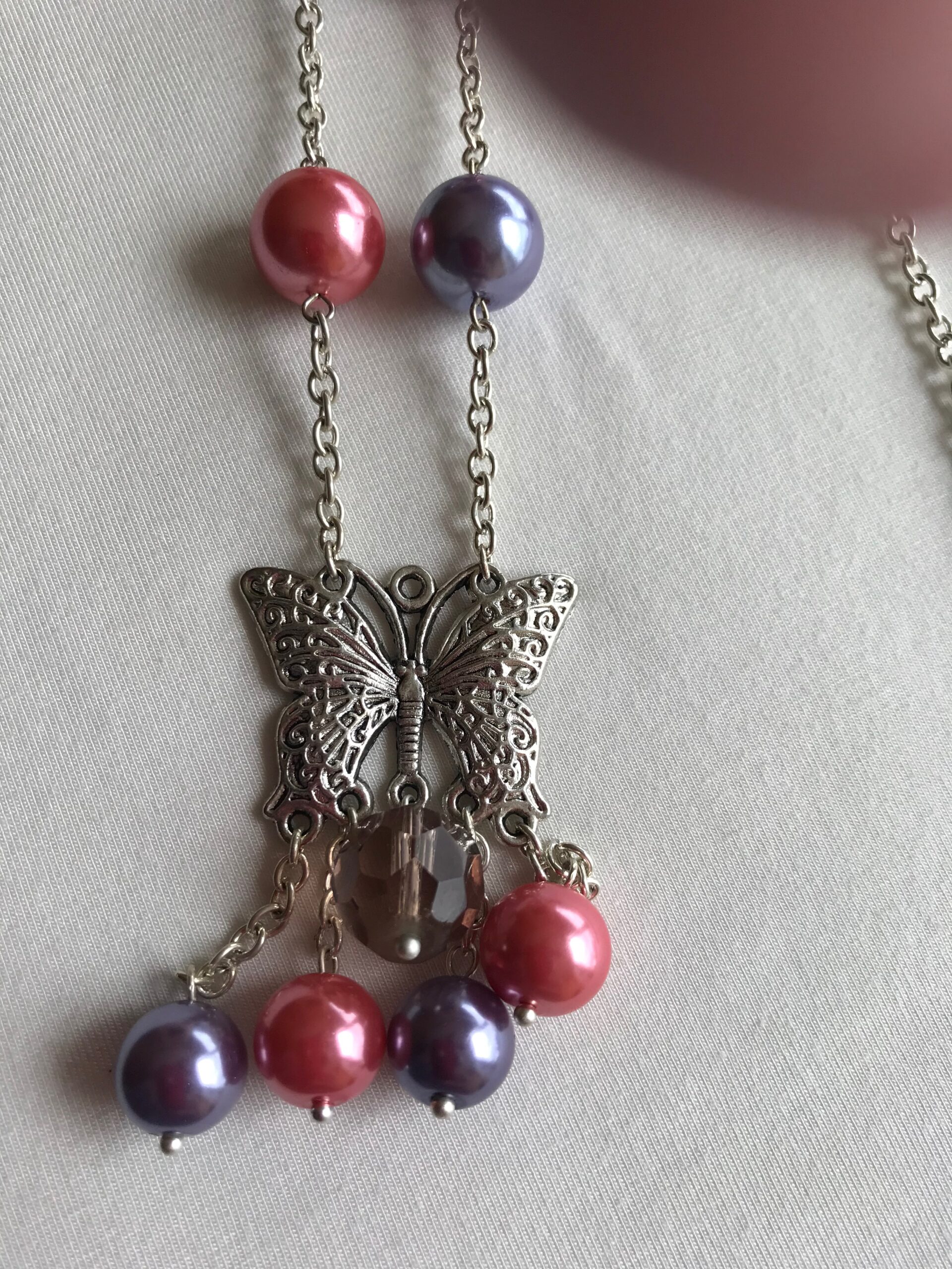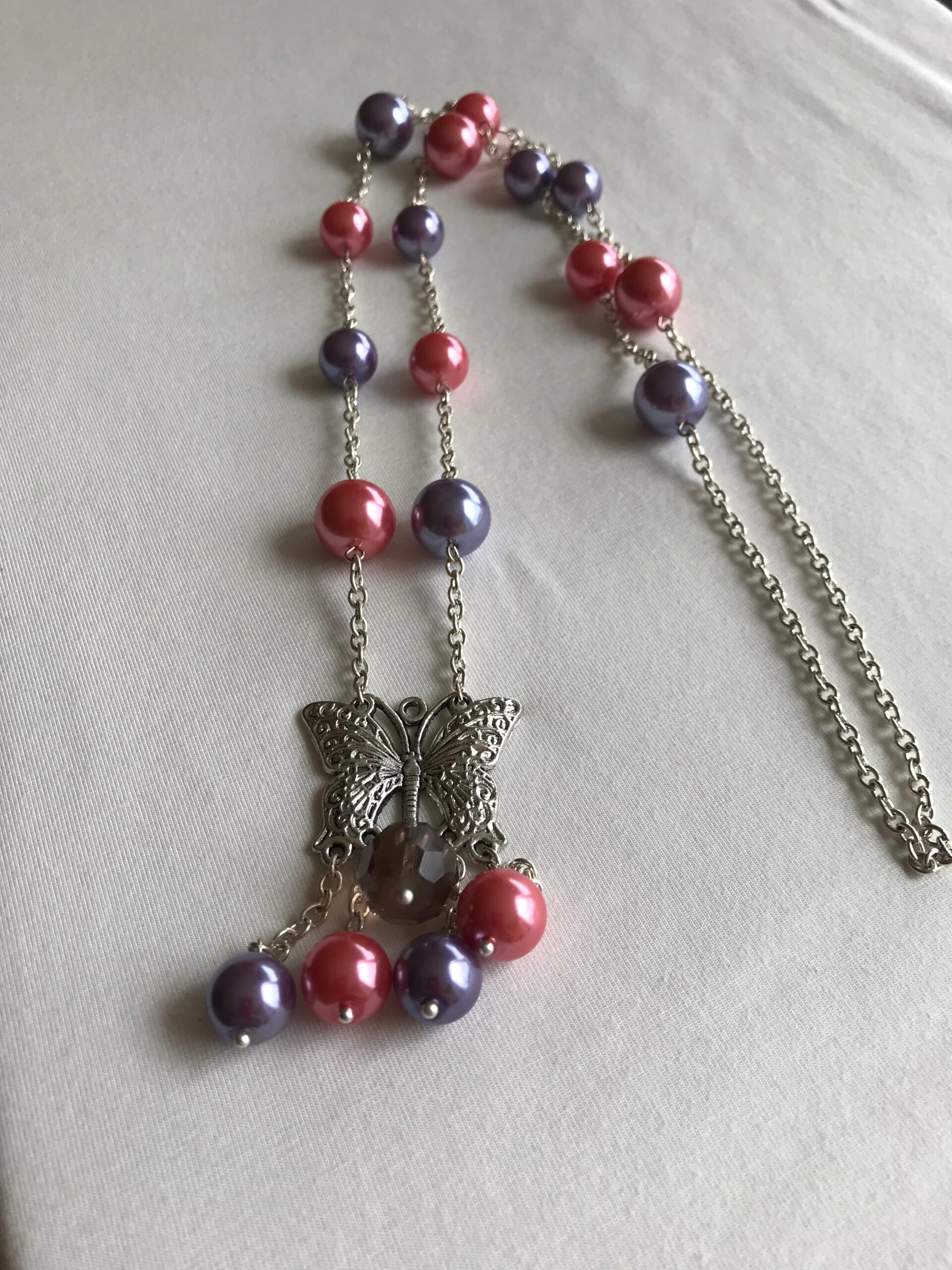 Home / Jewelry / Purple and Pink Glass Pearl Butterfly Chain Necklace