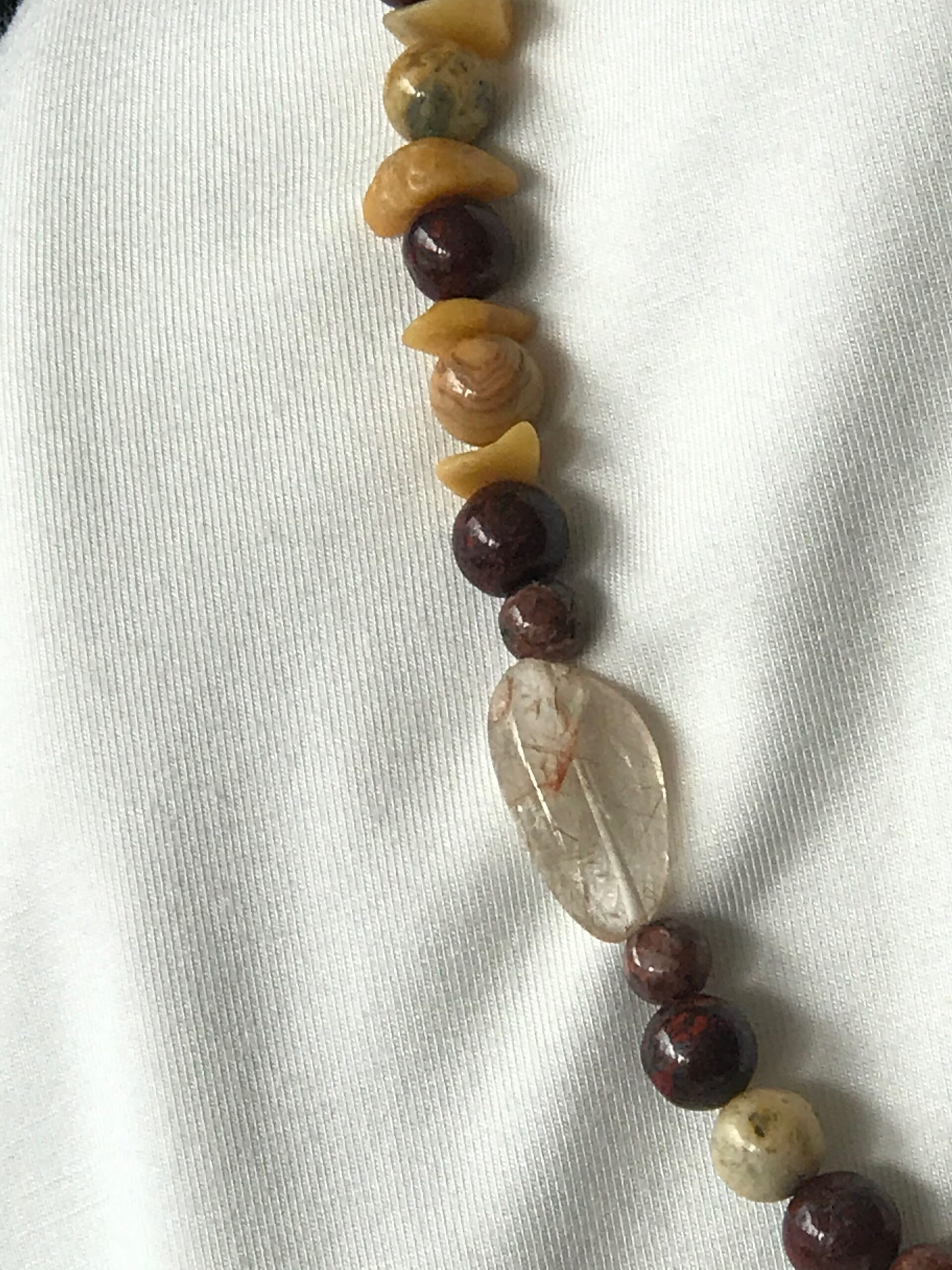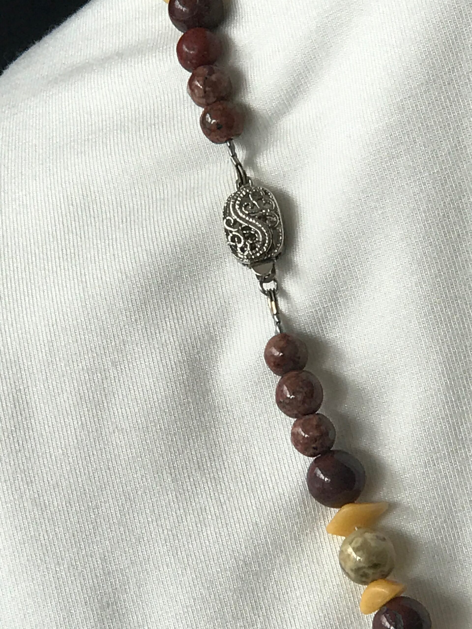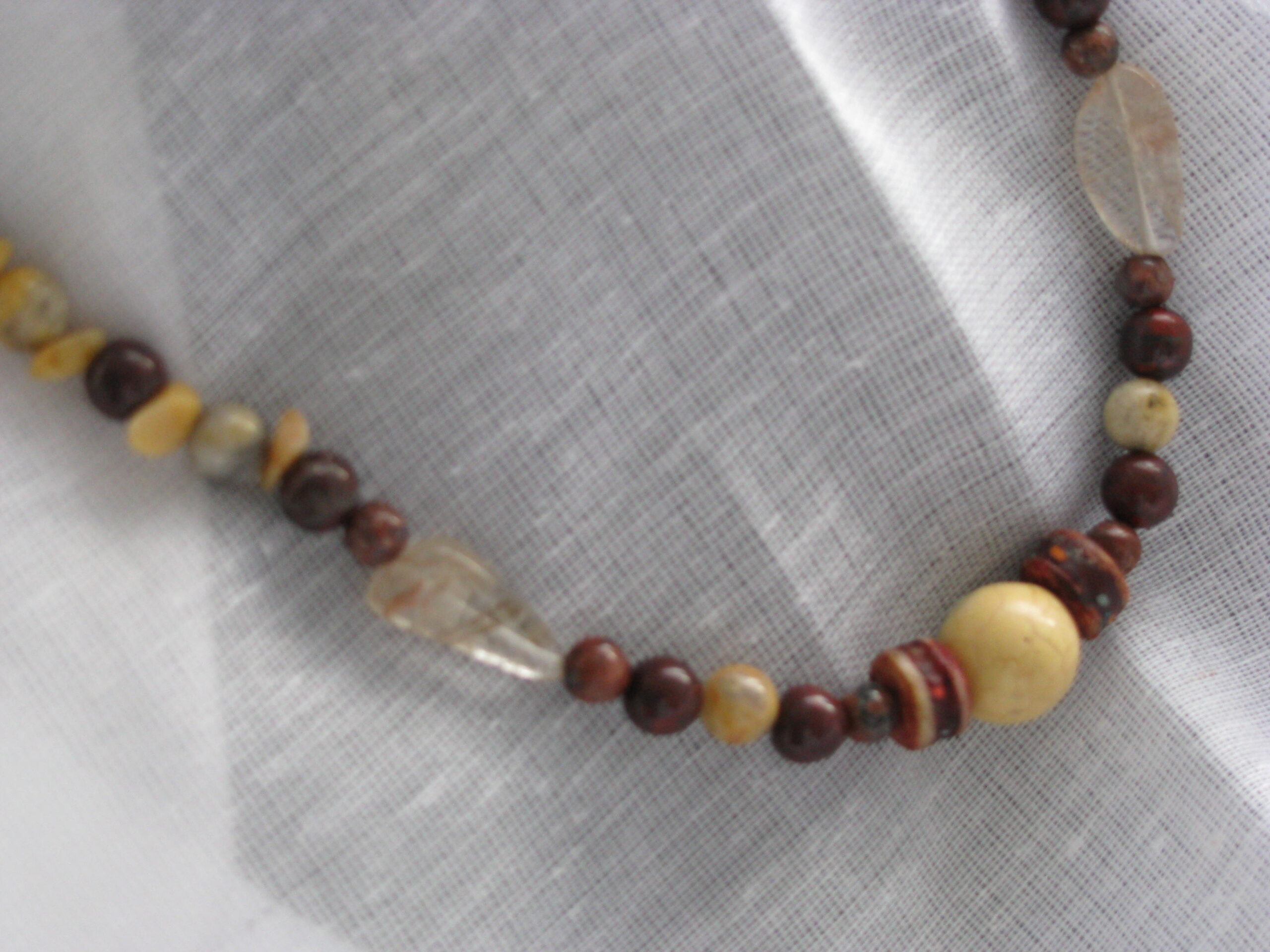Compostion:Press in Filigri Sterling Silve Clasp. Red and Sand Jasper beads used with 4 Rutilated quartz (needle like centres in clear quartz.)