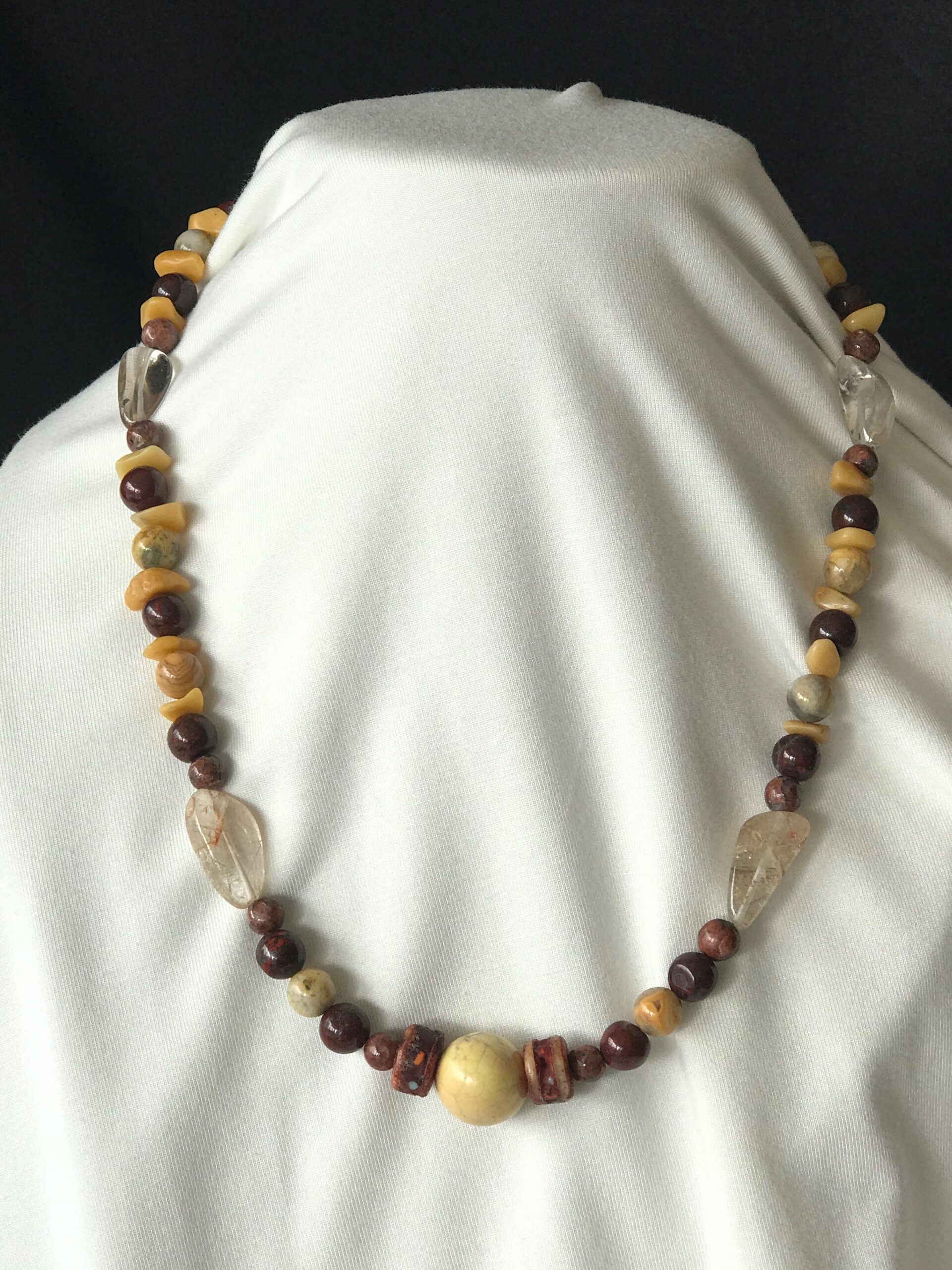 Tan and Red coloured Necklace: With antique woden and Sandstone coloured Feature beads.