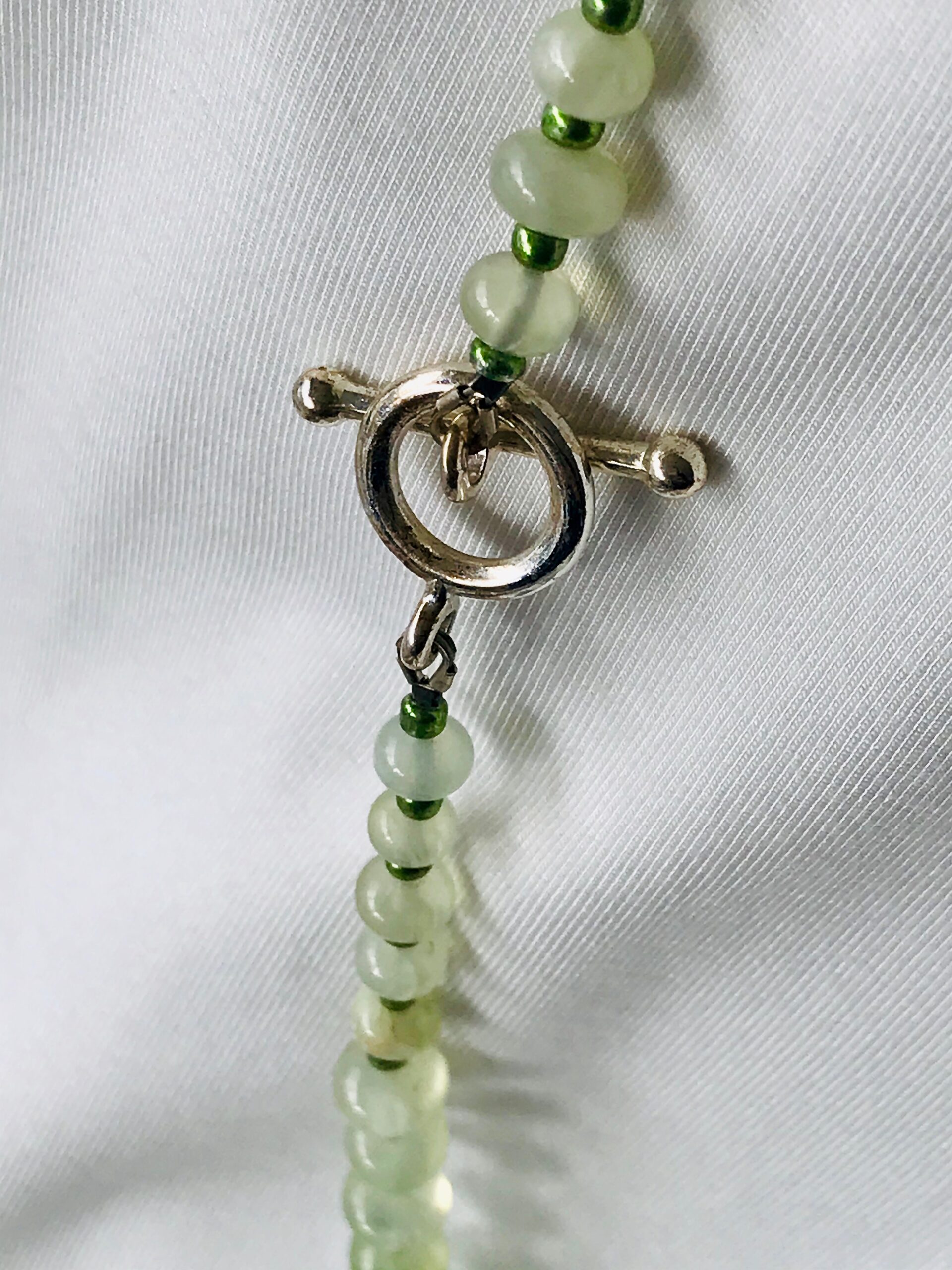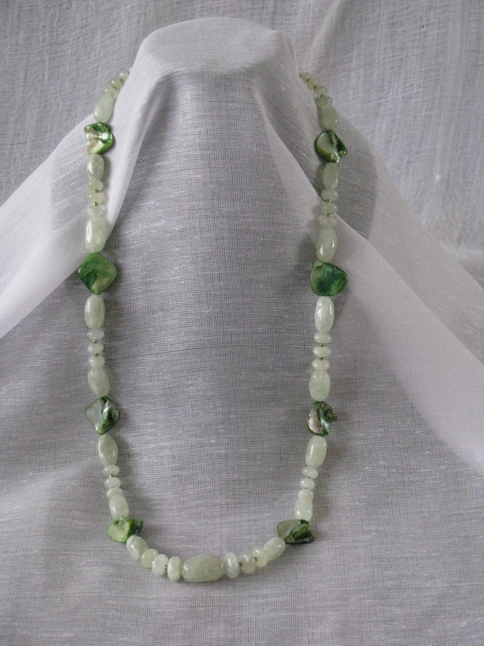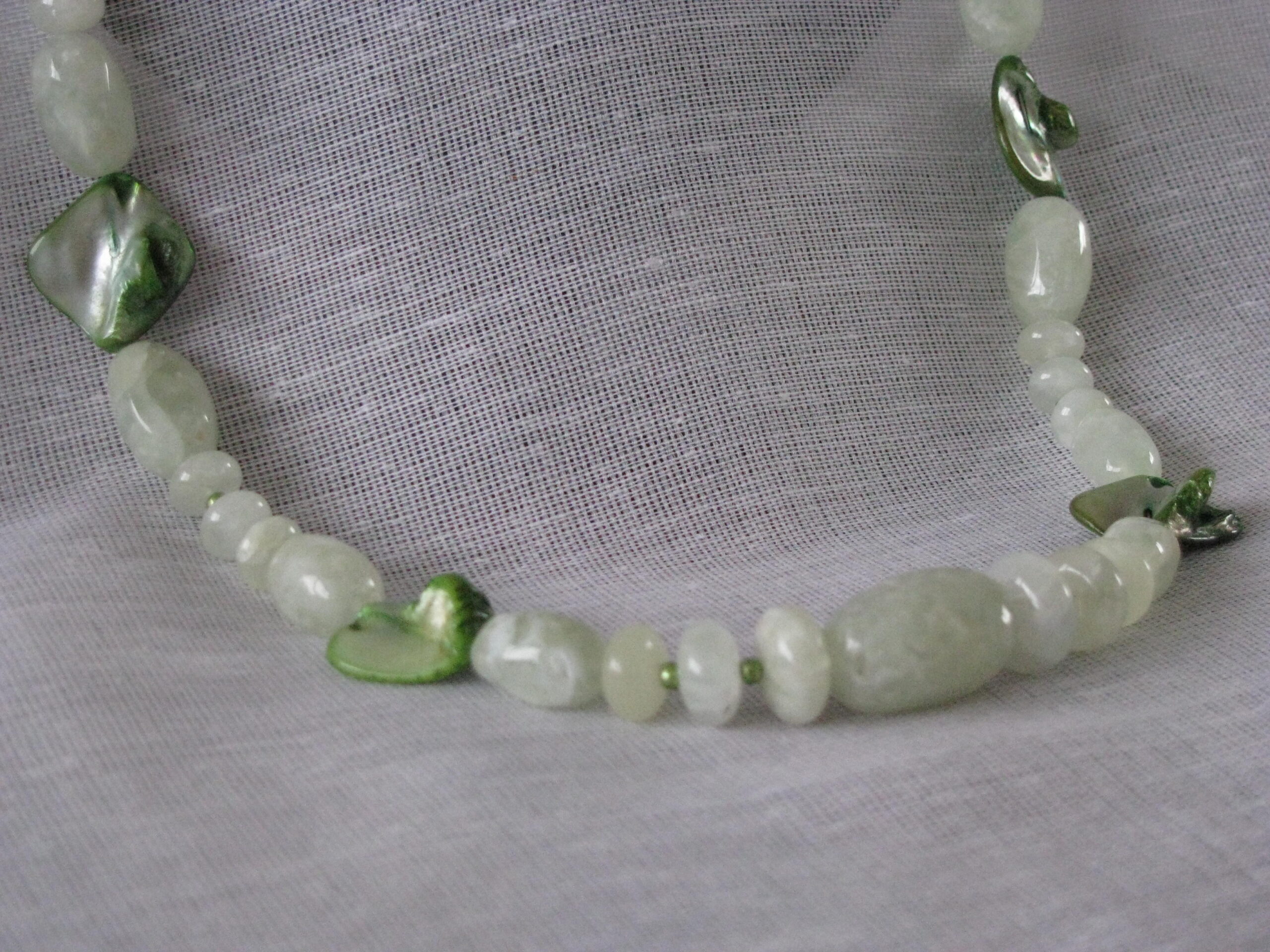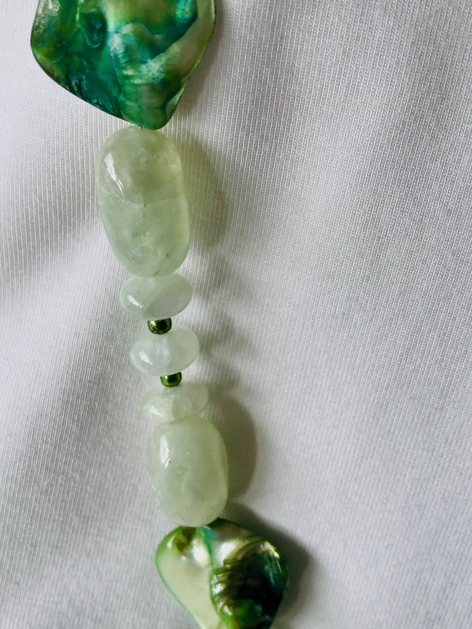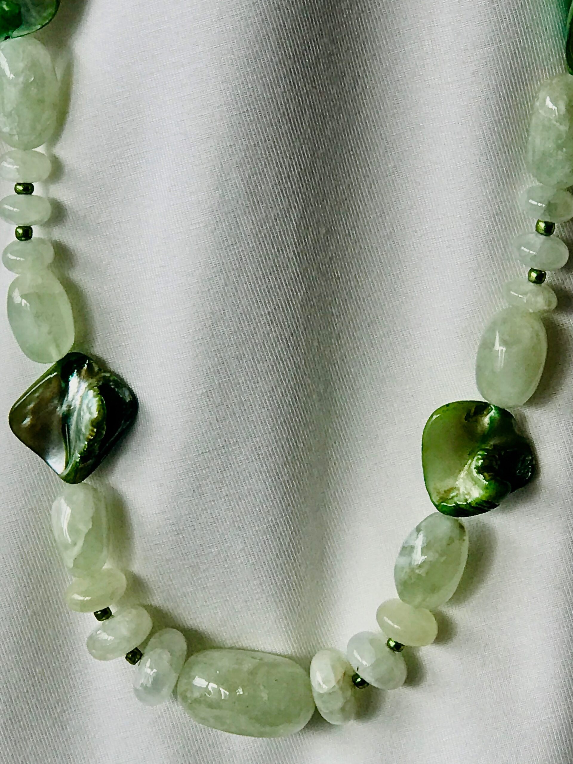 Different Sizes of Soft Green Prehnite used for complete longer Necklace with 8 Keshi Fresh Water Pearls