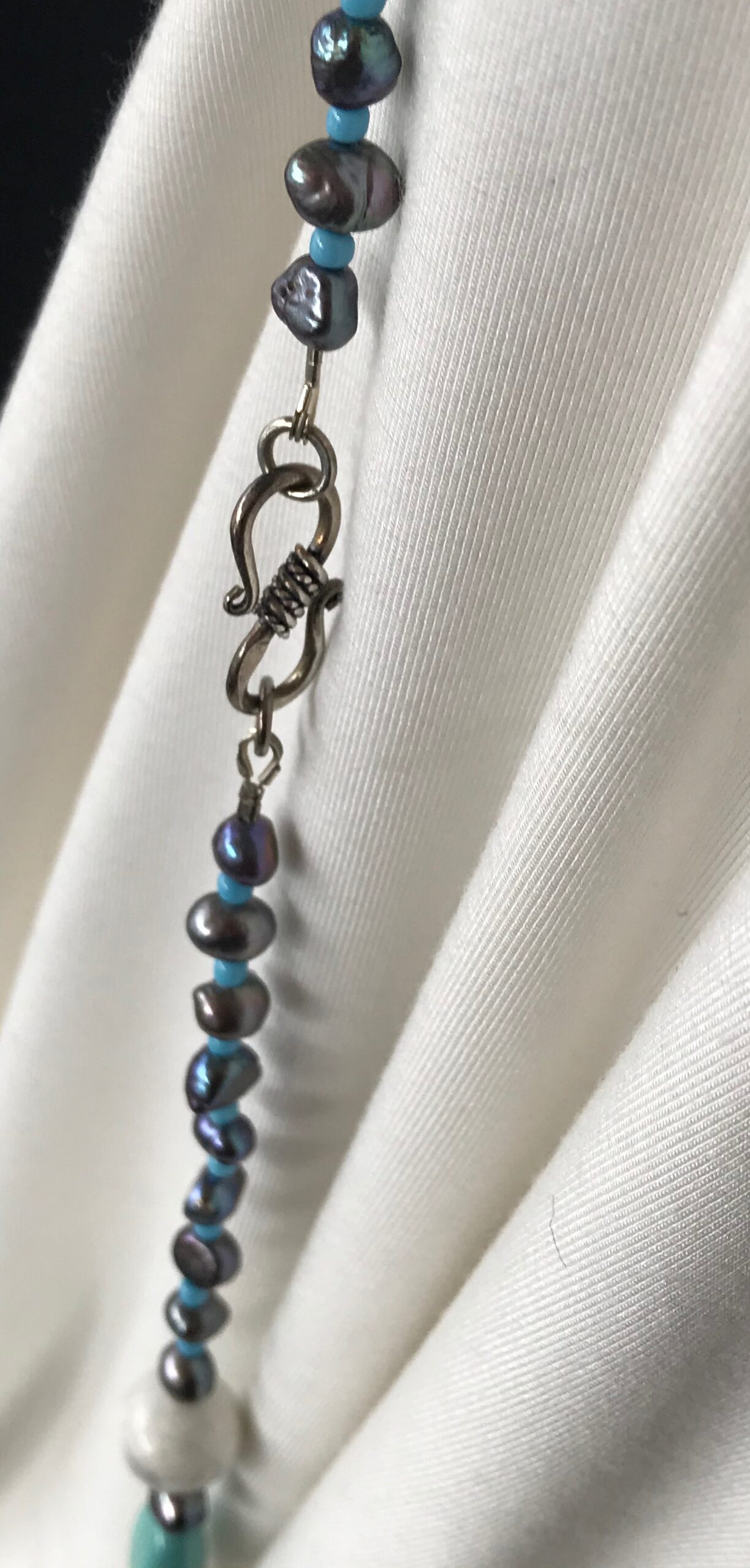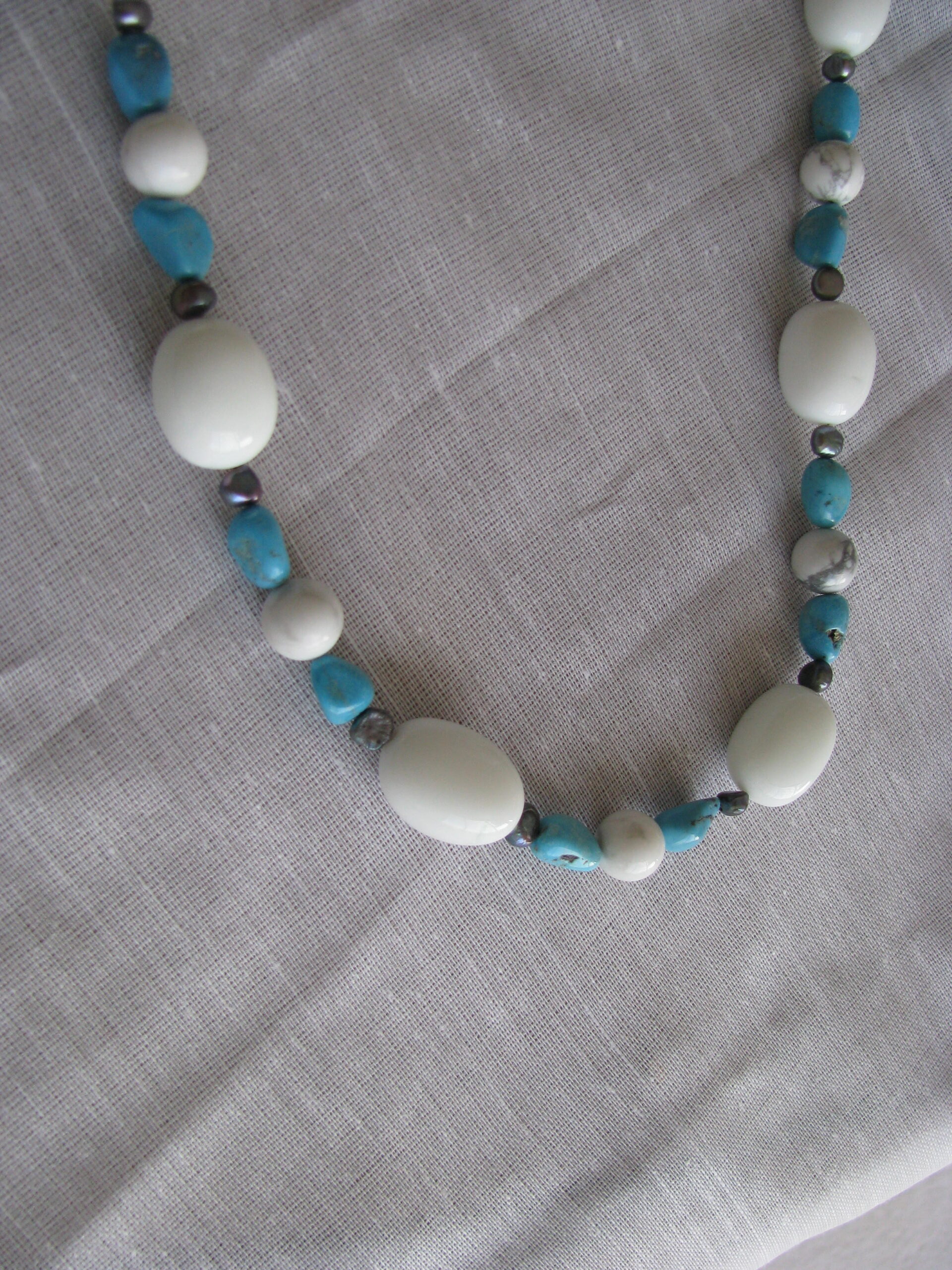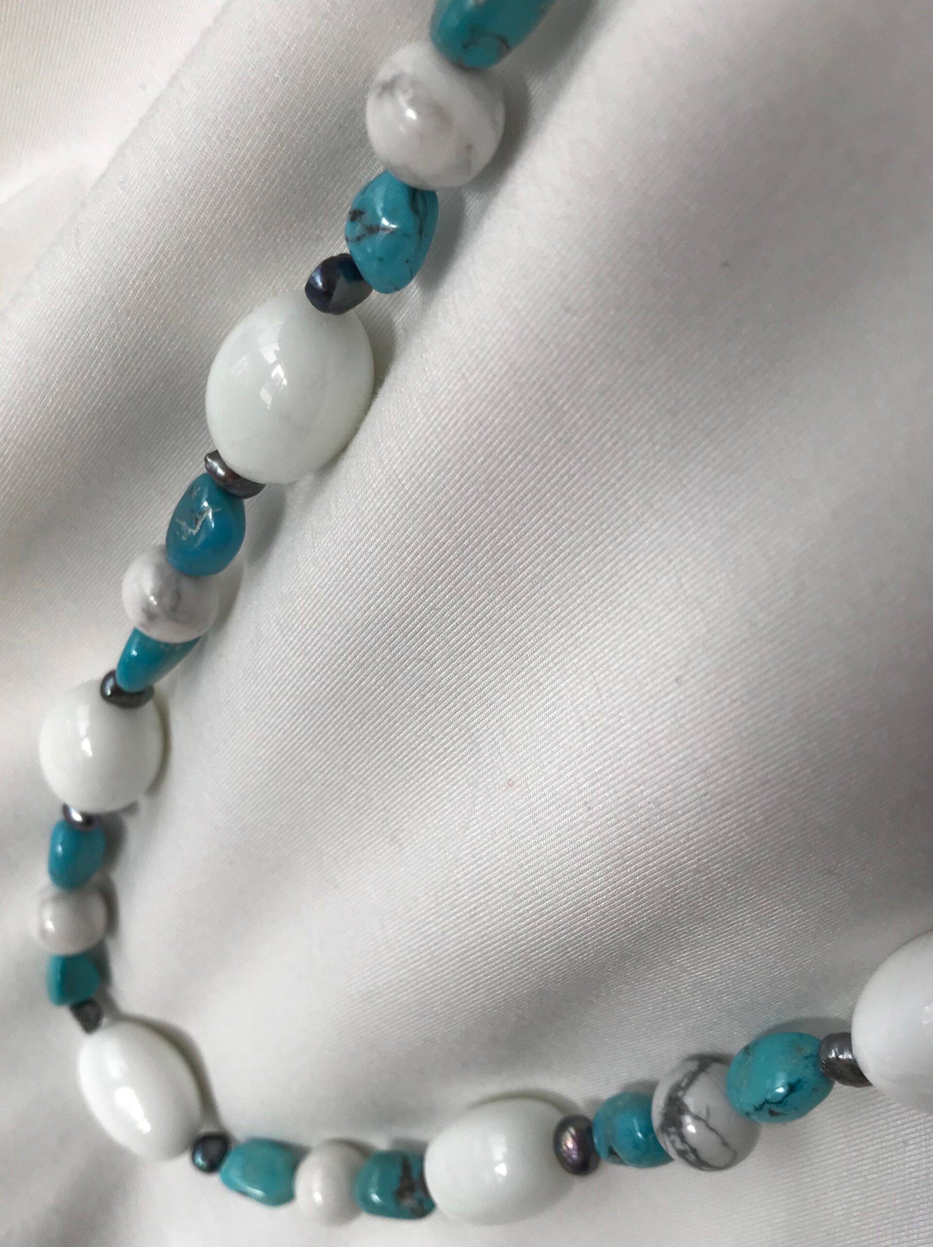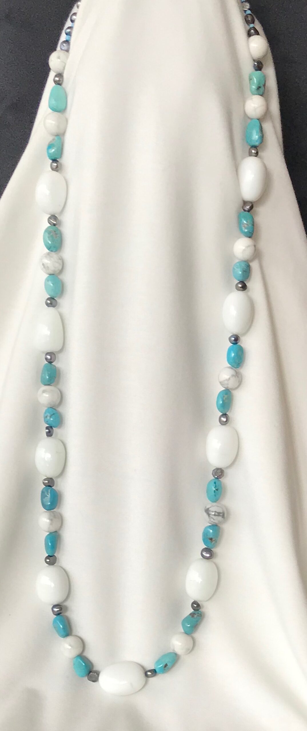Stunning long chunky necklace, made from real Turquoise, White Agate Egg and White Howlite round. Freshwater grey pearls. Great for summer.