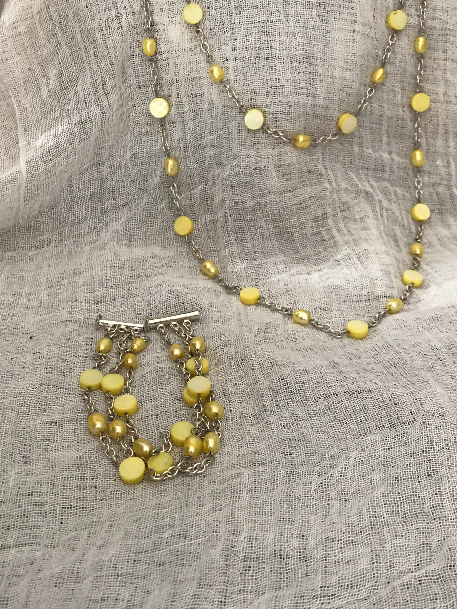 Long Chain Necklace made with small rice and flat round Yellow fresh water pearls.